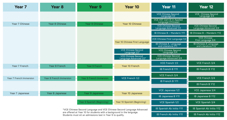 In Senior School, students can continue studying their languages in either VCE or IB. Admission into VCE and IB languages is subject to a placement test to ensure that students study the appropriate level of language. IB Ab initio courses are beginner courses.